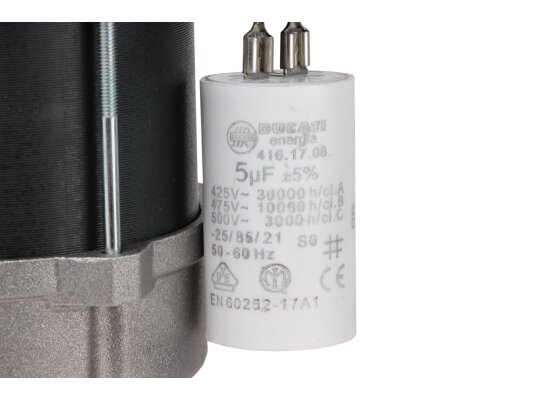 - В цепь прибора встроен конденсатор электроёмкостью 5 мкФ и верхним пределом рабочего напряжения 450 В. Его предназначение — создать крутящий момент при пуске мотора от источника 220 В и не допустить значительных просадок параметров сети.
