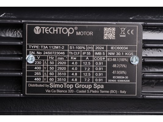 Электродвигатель CIB Unigas IE3 112M-2P-B5, арт: 218101502 характеризуется надёжным исполнением, высоким уровнем защиты электрических компонентов от воздействия пыли и влаги (класс IP 55), низким уровнем вырабатываемого шума, стабильной работой. Произведен из износо-, коррозиестойких материалов. Для тепловой защиты в корпусе предусмотрены широкие ребра охлаждения. Для крепления на рабочую поверхность конструкция снабжена монтажными опорами. Мотор работает от сети 230В /400 В. Мощность – 4000 Вт. Двигатель поставляется с проводом питания длиной 1,25 м.